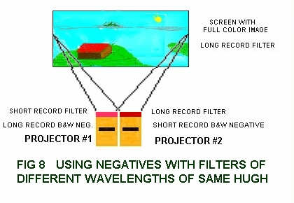 have been used to produce a full color image.Using colors that are close in wavelength will produce muddier colors, as they will not have much contrast. The greatest contrast and most vibrant color image will be produced when the filters are from opposite ends of the spectrum. Thus a Red filter for the long record, and a Violet filter for the short record will produce the best results.